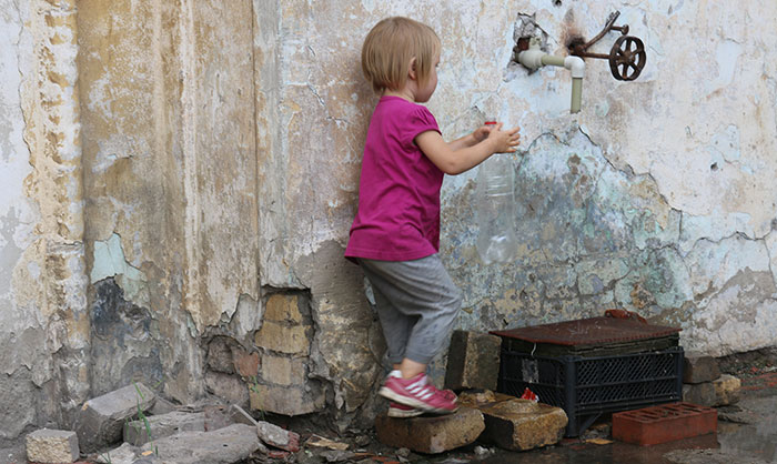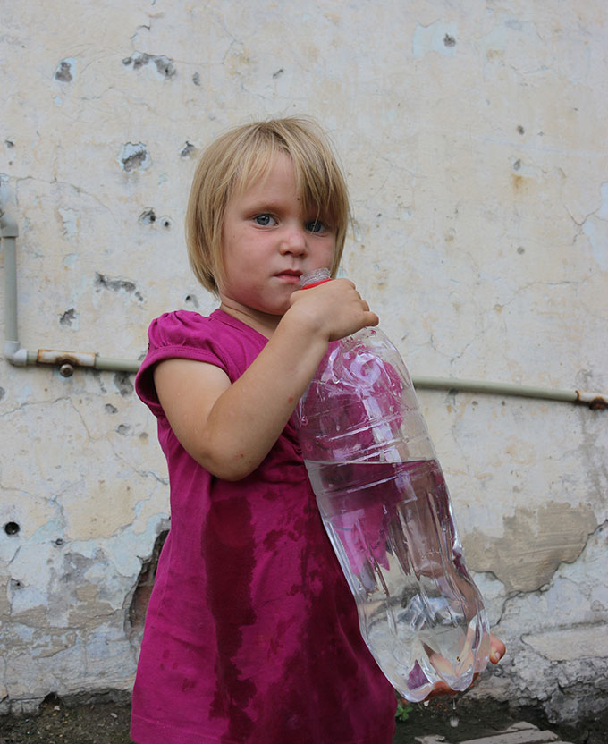 Ця дівчинка прийшла набрати води в пластикову пляшку до дому молитви «Церкви Христа Спасителя» у м. Красногорівка Донецької області. На стіні будинку видно сліди від осколків снарядів, що недавно розривалися біля церкви. Коли розпочалася війна, то в першу чергу місцеві жителі відчули гостру нестачу питної води. Тому члени «Церкви Христа Спасителя» не стали чекати на допомогу ззовні, а своїми силами вручну пробили свердловину (більше ніж 30 метрів завглибшки) для забезпечення місцевого населення питною водою. Матеріальне становище в місті трохи покращилося, але й понині жителі приходять сюди брати воду. Кран, виведений на зовнішню стіну, доступний у будь-яку хвилину доби.