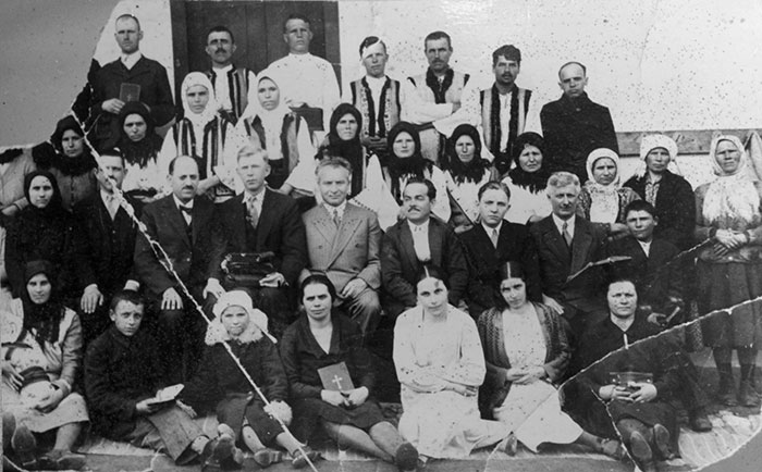 Пауль Петерсон (другий ряд, четвертий зліва) та Густав Шмідт (у центрі) у Горішніх Ширівцях, 1930-ті роки. Другий справа — Циганюк Степан, у верхньому ряду третій зліва — пресвітер Босовик Іван.