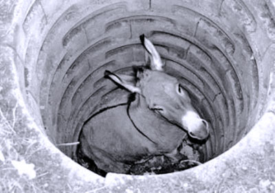 Він був вражений від того, що побачив. Віслюк землю, яка падала на його спину, струшував і притоптував копитами. І дуже швидко, на подив усіх, з’явився нагорі — і вистрибнув із колодязя!