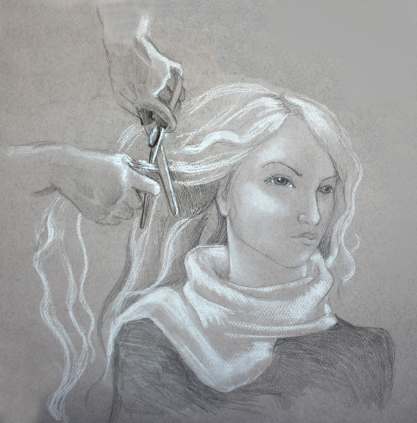 Прекрасне волосся Делли розсипалось каштановими хвилями, сяючи, мов струмені водоспаду. Воно спадало нижче її колін і вкривало, наче плащем, майже всю її постать. Потім вона знову, нервуючи і поспішаючи, підібрала його. Завагавшись, постояла якусь мить нерухомо, і дві чи три сльози впали на потертий червоний килим.