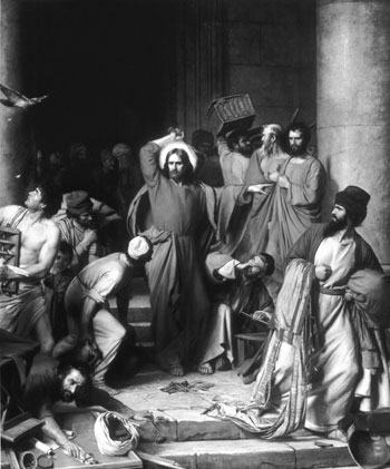 «Наближалася Пасха юдейська, і прийшов Ісус в Єрусалим. І знайшов, що у храмі продавали волів, овець і голубів, і сиділи міняльники грошей. І зробивши бич з мотузків, Він вигнав усіх з храму, і овець, і волів, а гроші міняльникам розсипав, поперевертавши їхні столи. А продавцям голубів сказав: «Заберіть це звідси і не робіть дому Отця Мого домом торгівлі» (Ів.2:13-16).
