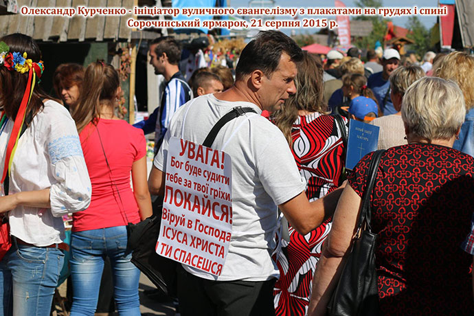 — Одного разу я почув голос: «Зроби плакат, одягай на себе і йди проповідуй!» Дух Святий дав мені слова: «Увага! Бог буде судити тебе за твої гріхи! Покайся, віруй в Ісуса Христа — і ти спасешся!» Коротко і ясно — вся суть Євангелії на цьому плакаті. Я молився, щоб Бог дав сили переступити через себе, адже розумів, яку реакцію це викличе. Це будуть прокльони, будуть проганяти, виставляти з електричок, автобусів. Одягнув плакат, іду по вулиці, їду в автобусі, електричці — відразу люди звертають увагу: білий плакат з червоними літерами. Щоб прочитати — кілька секунд, а Слово Боже — живе й діюче!