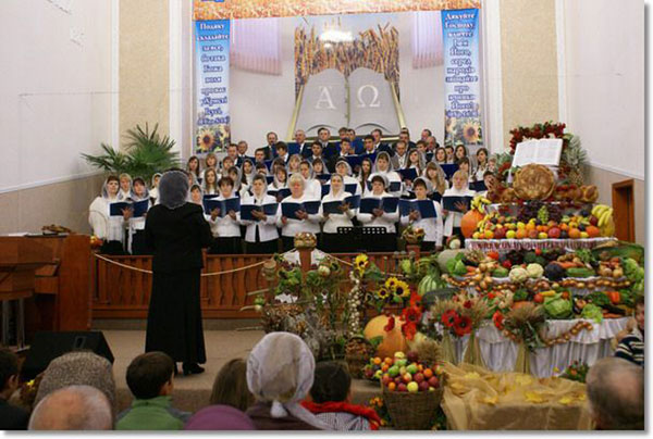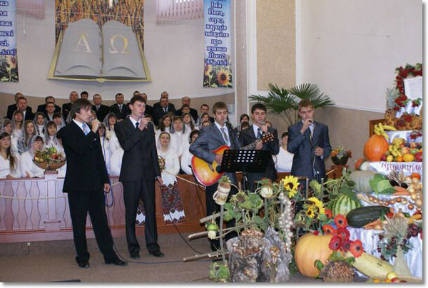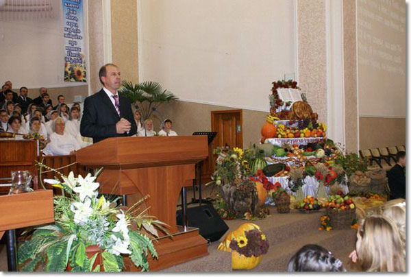 Захід проводився для того, щоб подякувати Богу за всі Його благословення. Сцена в приміщенні дому молитви була традиційно прикрашена всілякими плодами землі. На святковому столі лежали овочі та фрукти, гриби та велика хлібина, а також розгорнута Біблія, як символ духовного хліба.